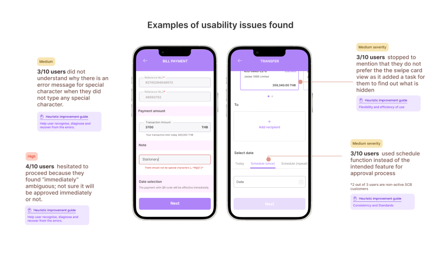 With a System Usability Scale (SUS) score slightly above the average at 70, we prioritised resolving high-severity issues by adding them directly to the product backlog. For example, we identified that transaction schedulers, who require manager approval, hesitated to proceed when they encountered the notification, “This transaction will be effective immediately.” This observation led the team to formulate a problem statement, revealing an opportunity to redesign the message to better align with user needs.