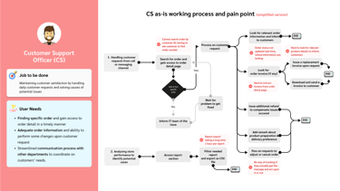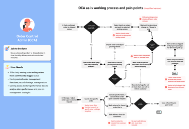 As a result, I mapped out current workflows, detailing activities and tools need of each process covering all interactions. For example, the picking process where the picking staff interacted with different system while picking and placing the products. Similarly, the record shortage process involved both digital interaction with the picking system in a mobile device, and manually crossing the items off the picking document.