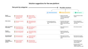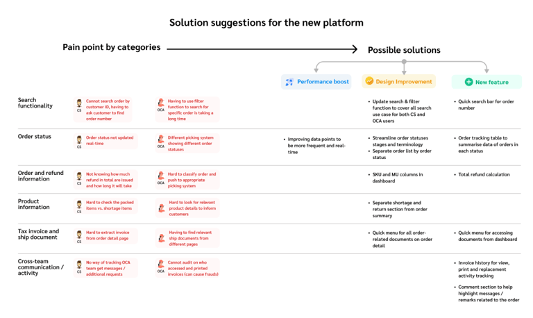 After reflecting upon current workflow and pain points, I collaborated with a product owner and a tech lead to propose a list of solutions addressing user problems. We categorised the suggestions into three areas:
