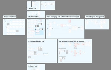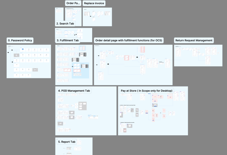 After defining the scope for the new platform, I began creating wireframes focused on essential functionalities for different user roles, including the order control unit and customer service staff. I aimed to streamline pages with overlapping functions, such as the order detail page, accessible by both teams but with role-specific permissions functionalities.
