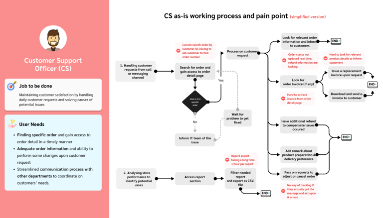 The prior order management platform involved multiple stakeholders, but for the initial MVP, we focused on customer support officers (CS) at the HQ office and order control admins (OCS) at 154 stores in Thailand. The working team were made aware that there was a need to migrate the fulfilment functionality to a new platform to enhance its performance.